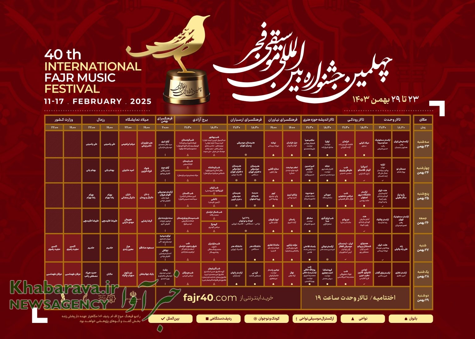 فروش بلیت‌های چهلمین جشنواره بین‌المللی موسیقی فجر از روز ۱۸ بهمن ماه ساعت ۱۴ در سامانه  fajr40.com  آغاز می‌شود.
