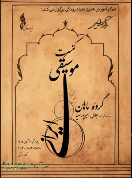 کنسرت گروه موسیقی ایرانی «ماهان» به سرپرستی جلال امیرپور سعید، توسط مرکز آموزش هنری بنیاد رودکی، ۷ آبان ماه در تالار رودکی برگزار می‌شود. به گزارش خبرآوا و به نقل از بنیاد رودکی، در این کنسرت که در دو سانس ۱۸:۳۰ و ۲۰:۳۰ روی صحنه می‌رود، هنرجویان مرکز آموزش هنری این بنیاد، قطعاتی از موسیقی […]
