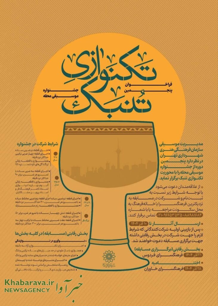 دفتر موسیقی سازمان فرهنگی هنری شهرداری تهران، پنجمین دوره جشنواره «موسیقی محله» را این‌بار با محوریت تکنوازی تنبک برگزار می‌کند؛ جشنواره‌ای که در چند گروه سنی، همراه با مراحل رقابتی، نوآوری در نوازندگی و اجرای قطعات مشخص، پذیرای علاقه‌مندان از سراسر پایتخت است. به گزارش خبرآوا و به نقل از پایگاه جشنواره، دفتر موسیقی سازمان […]