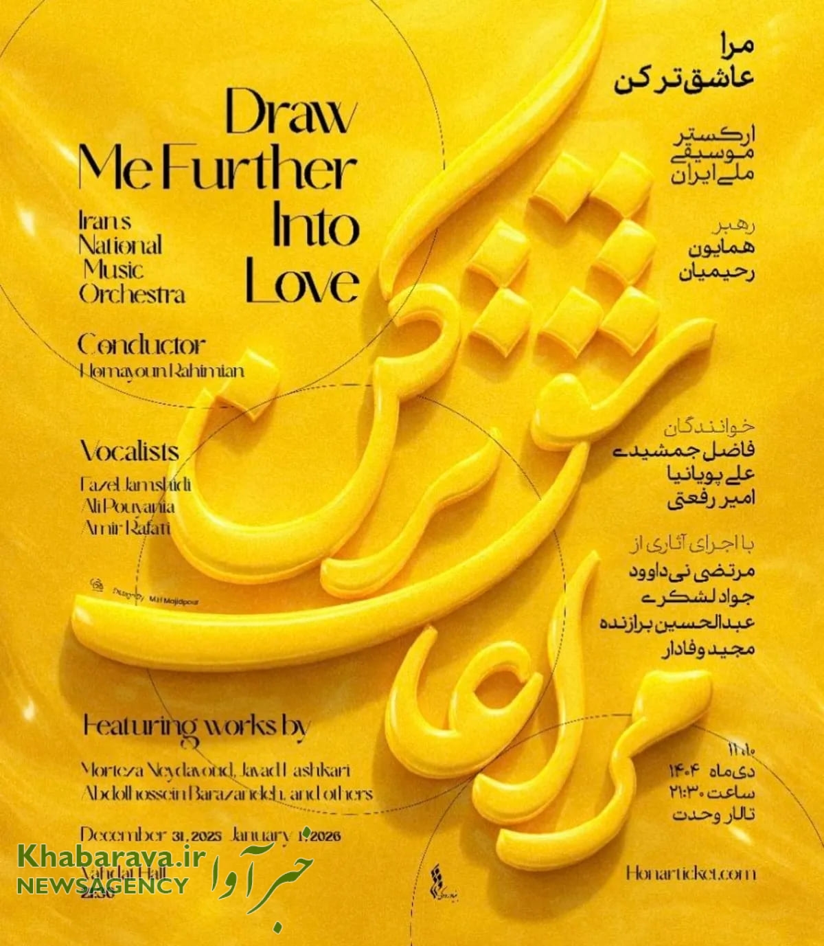 ارکستر موسیقی ملی ایران به رهبری همایون رحیمیان، نخستین اجرای رسمی خود در فصل زمستان را با کنسرتی با عنوان «مرا عاشق‌تر کن…» طی دو شب، ۱۰ و ۱۱ دی‌ ماه ۱۴۰۴، در تالار وحدت روی صحنه می‌برد. در این کنسرت جمعی از خوانندگان موسیقی ایرانی شامل فاضل جمشیدی، علی پویانیا و امیر رفعتی، ارکستر […]