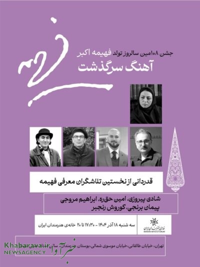 جشن «آهنگ سرگذشت» یادبود فهیمه اکبر برگزار می شود. جشن ۱۰۸ مین سالروز تولد فهیمه اکبر، با عنوان «آهنگ سرگذشت» سه شنبه ۱۸ آذر، از ساعت ۱۷.۳۰ تا ۲۰ در خانه هنرمندان ایران، سالن استاد جلیل شهناز برگزار می شود. این مراسم برای یادبود بانو فهیمه اکبر، هنرمندی ست که آوازهایش برای ایران در جنگ جهانی دوم مانگار شد. به همین مناسبت، «جوما»، ترانه های فهیمه اکبر و جهانگیر سرتیپ پور در جنگ جهانی دوم و اشغال گیلان را اجرا خواهد کرد. مراسم آهنگ سرگذشت، پیام ...